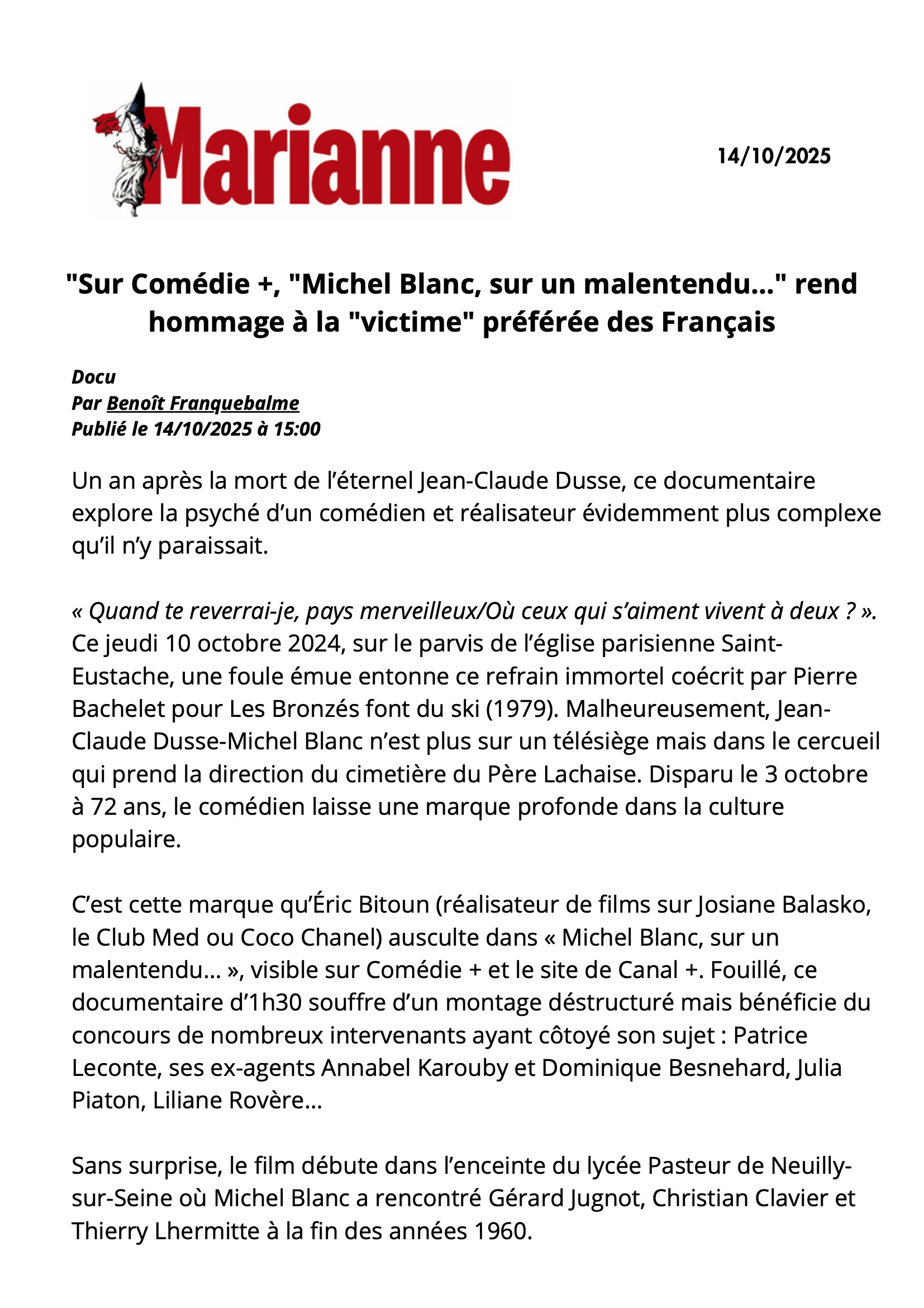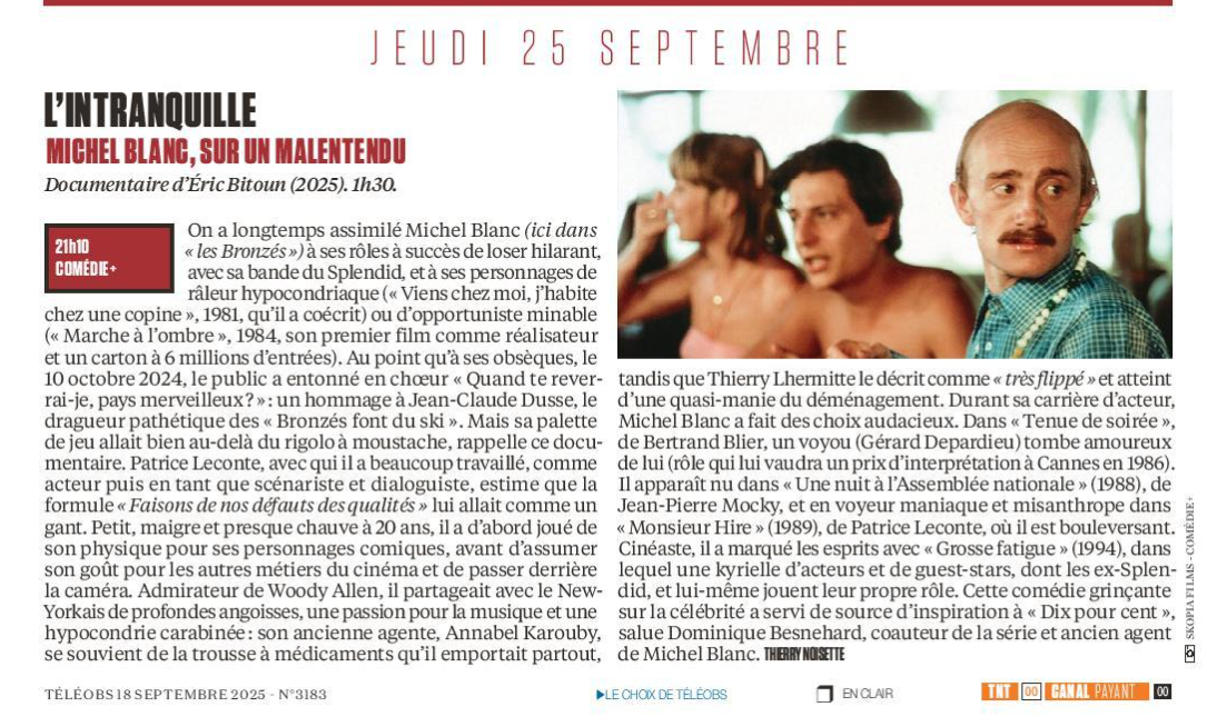 Membre fondateur de la célèbre troupe du Splendide, Michel Blanc a marqué des générations avec des comédies cultes comme Les Bronzés, avant de se révéler en solo comme un comédien capable de rôles dramatiques, et un réalisateur incisif. Alliant humour, tendresse et profondeur, Michel Blanc, sur un malentendu… propose d’explorer les multiples facettes de l’homme et de l’artiste. À travers des archives, des scènes d’anthologie et des témoignages de proches et de partenaires, il met en lumière l’un des visages les plus singuliers du cinéma français. Michel Blanc se dévoile entre rires, doutes et mélancolie, nous invitant à comprendre ce qui fait de lui un personnage si profondément humain.